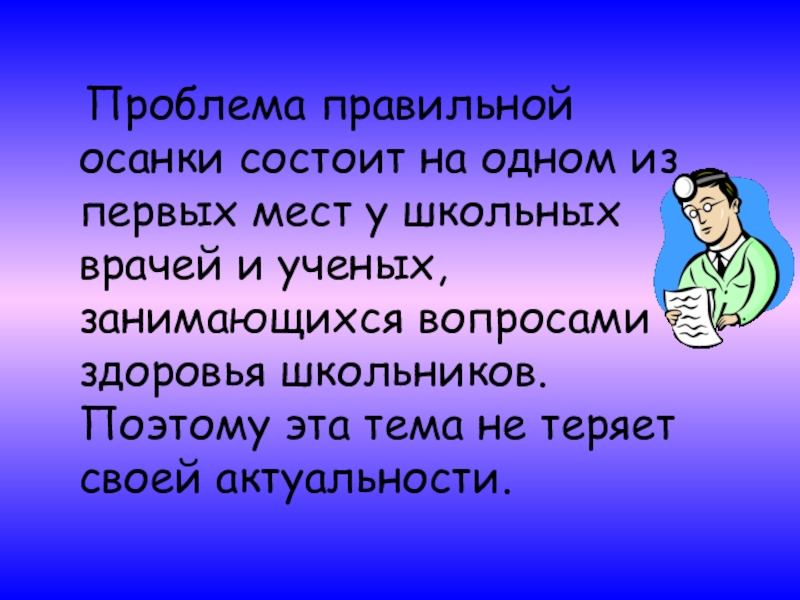 у школьных врачей и ученых, занимающихся вопросами здоровья школьников. Поэтому эта тема не теряет своей актуальности.