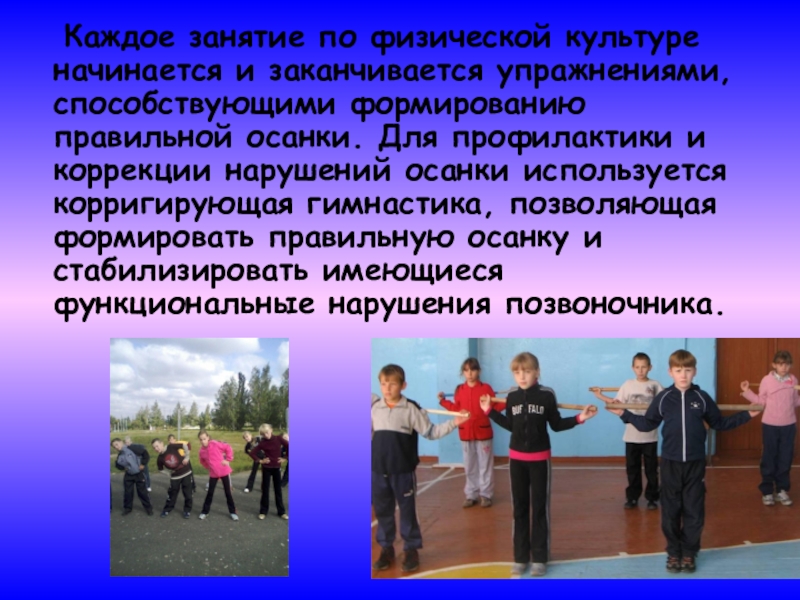 правильной осанки. Для профилактики и коррекции нарушений осанки используется корригирующая гимнастика, позволяющая формировать правильную осанку и стабилизировать имеющиеся функциональные нарушения позвоночника.