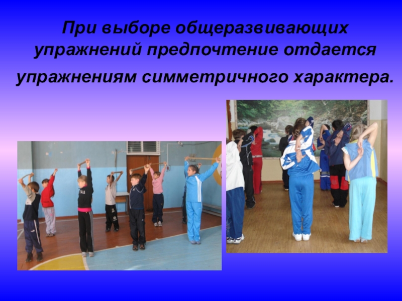 Слайд 20При выборе общеразвивающих упражнений предпочтение отдается упражнениям симметричного характера.