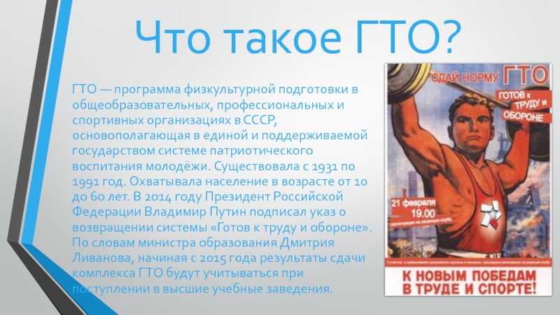 спортивных организациях в СССР, основополагающая в единой и поддерживаемой государством системе патриотического воспитания молодёжи. Существовала с 1931 по 1991 год. Охватывала население в возрасте от 10 до 60 лет. В 2014 году Президент Российской Федерации Владимир Путин подписал указ о возвращении системы «Готов к труду и обороне». По словам министра образования Дмитрия Ливанова, начиная с 2015 года результаты сдачи комплекса ГТО будут учитываться при поступлении в высшие учебные заведения.