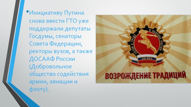 Слайд 17Инициативу Путина снова ввести ГТО уже поддержали депутаты Госдумы, сенаторы Совета