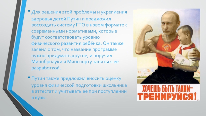 воссоздать систему ГТО в новом формате с современными нормативами, которые будут соответствовать уровню физического развития ребёнка. Он также заявил о том, что название программе нужно придумать другое, и поручил Минобрнауки и Минспорту заняться её разработкой.