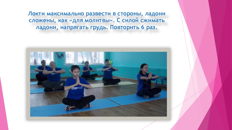 Слайд 12Локти максимально развести в стороны, ладони сложены, как «для молитвы». С