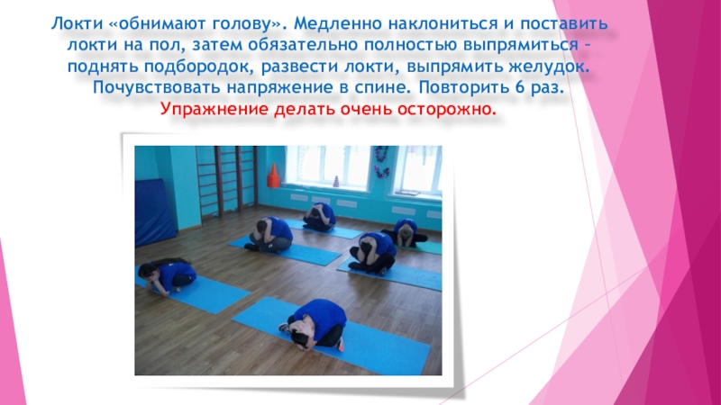 Слайд 19Локти «обнимают голову». Медленно наклониться и поставить локти на пол, затем
