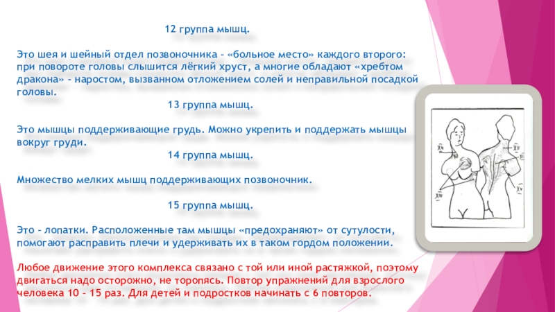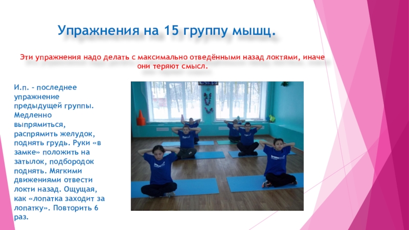 И.п. – последнее упражнение предыдущей группы. Медленно выпрямиться, распрямить желудок, поднять грудь. Руки «в замке» положить на затылок, подбородок поднять. Мягкими движениями отвести локти назад. Ощущая, как «лопатка заходит за лопатку». Повторить 6 раз.