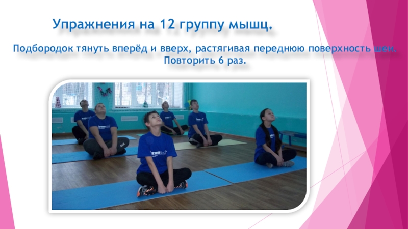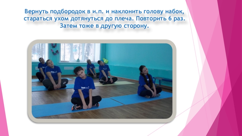 Слайд 8Вернуть подбородок в и.п. и наклонить голову набок, стараться ухом дотянуться