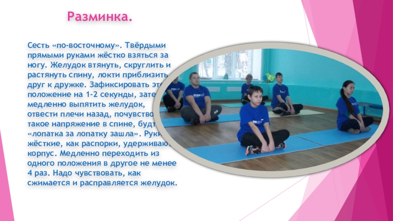 взяться за ногу. Желудок втянуть, скруглить и растянуть спину, локти приблизить друг к дружке. Зафиксировать это положение на 1-2 секунды, затем медленно выпятить желудок, отвести плечи назад, почувствовать такое напряжение в спине, будто «лопатка за лопатку зашла». Руки жёсткие, как распорки, удерживают корпус. Медленно переходить из одного положения в другое не менее 4 раз. Надо чувствовать, как сжимается и расправляется желудок.