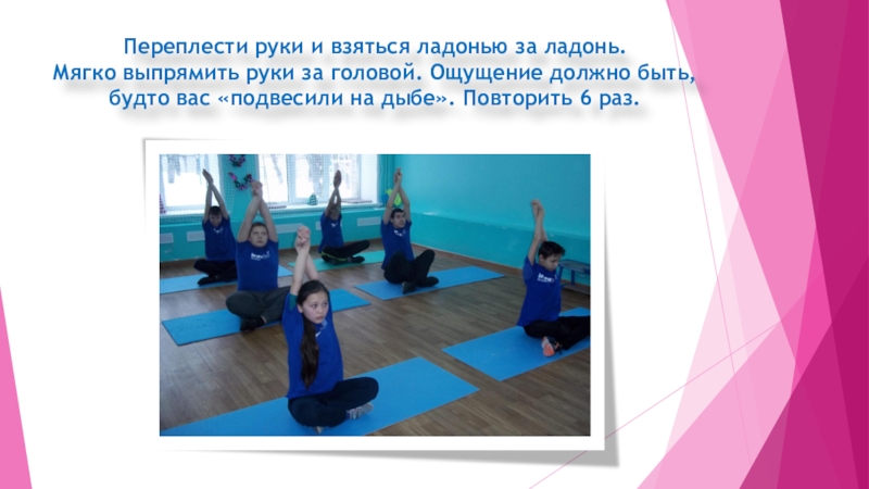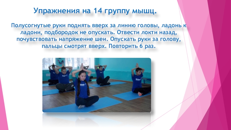 ладонь к ладони, подбородок не опускать. Отвести локти назад, почувствовать напряжение шеи. Опускать руки за голову, пальцы смотрят вверх. Повторить 6 раз.