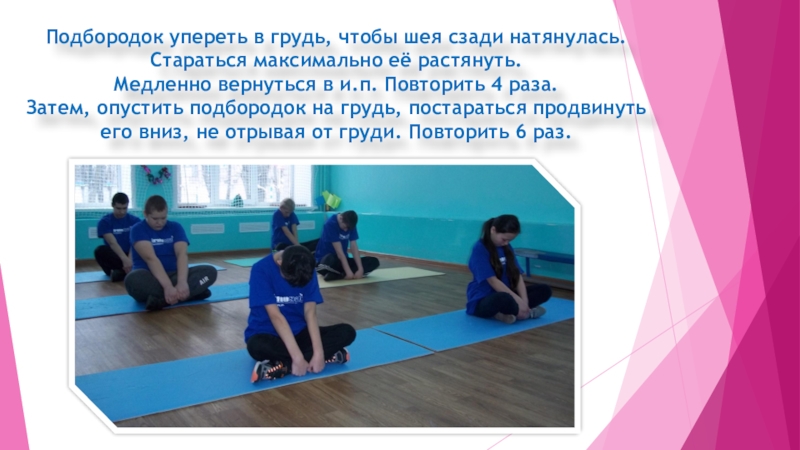 Слайд 9Подбородок упереть в грудь, чтобы шея сзади натянулась. Стараться максимально её