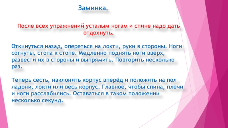 После всех упражнений усталым ногам и спине надо дать отдохнуть.