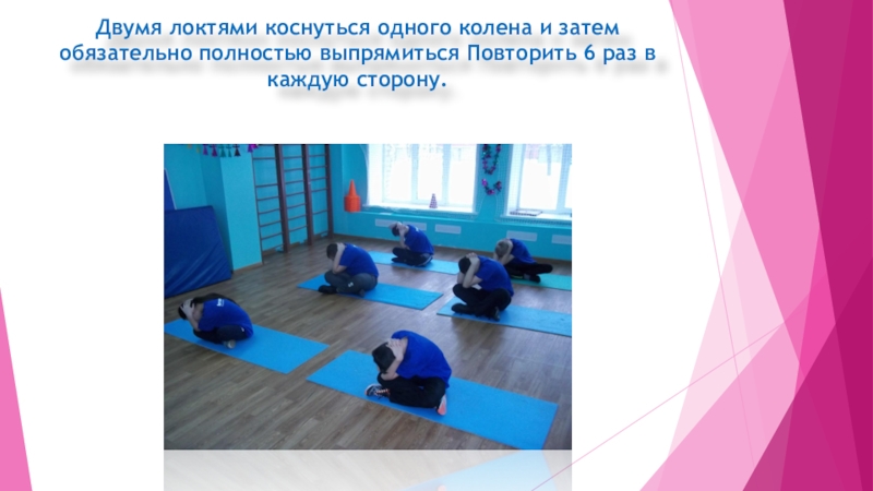 Слайд 20Двумя локтями коснуться одного колена и затем обязательно полностью выпрямиться Повторить