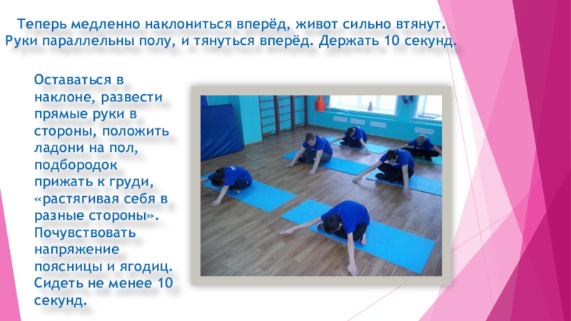 Оставаться в наклоне, развести прямые руки в стороны, положить ладони на пол, подбородок прижать к груди, «растягивая себя в разные стороны». Почувствовать напряжение поясницы и ягодиц. Сидеть не менее 10 секунд.