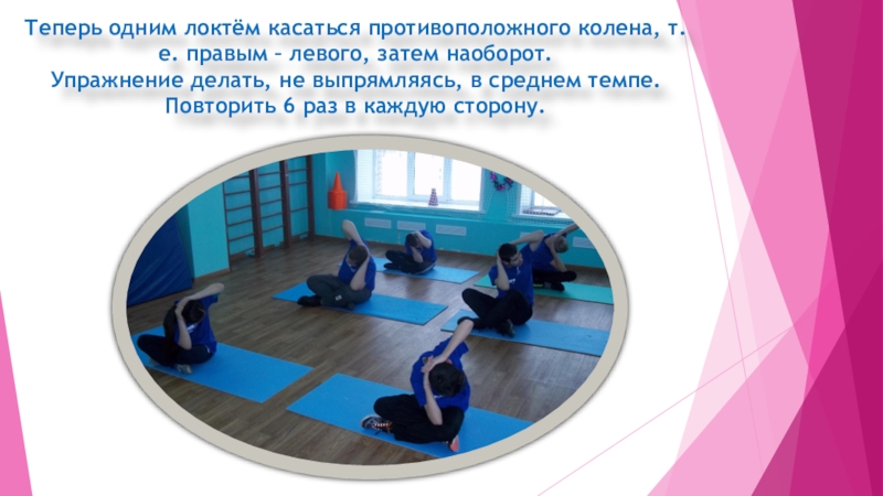 Слайд 21Теперь одним локтём касаться противоположного колена, т.е. правым – левого, затем