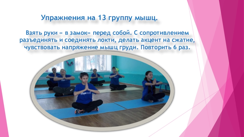 С сопротивлением разъединять и соединять локти, делать акцент на сжатие, чувствовать напряжение мышц груди. Повторить 6 раз.