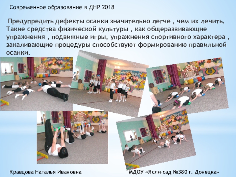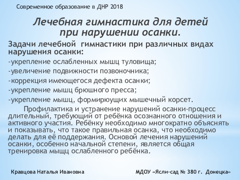 Осанка формируется с самого раннего детства и зависит от гармоничной работы мышц, состояния костной системы, связочно-суставного и нервно-мышечного аппарата, равномерности их развития, физиологических изгибов позвоночника. Слабое физическое развитие ребенка ведет к нарушениям осанки, а нарушения осанки затрудняют работу внутренних органов, что приводит к дальнейшему ухудшению физического развития.