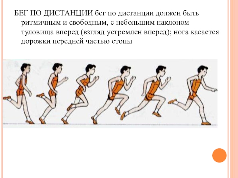 БЕГ ПО ДИСТАНЦИИ бег по дистанции должен быть ритмичным и свободным, с небольшим наклоном туловища вперед (взгляд