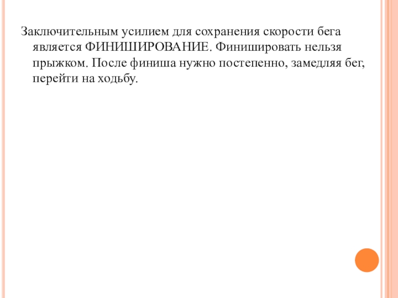 Слайд 11Заключительным усилием для сохранения скорости бега является ФИНИШИРОВАНИЕ. Финишировать нельзя прыжком.