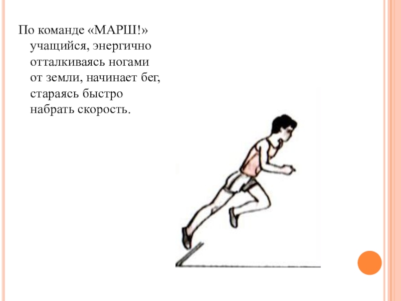 Слайд 8По команде «МАРШ!» учащийся, энергично отталкиваясь ногами от земли, начинает бег,