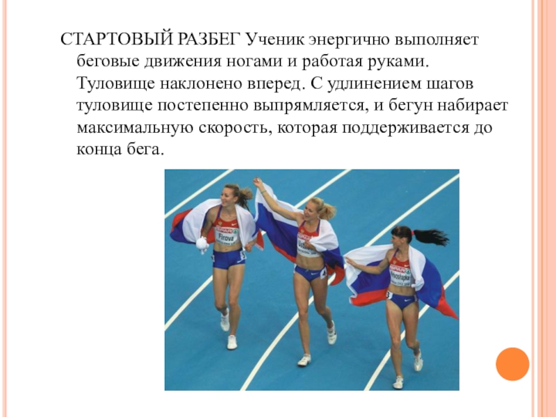 СТАРТОВЫЙ РАЗБЕГ Ученик энергично выполняет беговые движения ногами и работая руками. Туловище наклонено вперед. С удлинением шагов