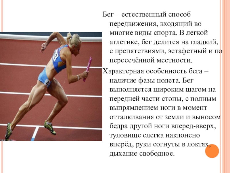 Бег – естественный способ передвижения, входящий во многие виды спорта. В легкой атлетике, бег делится на гладкий,