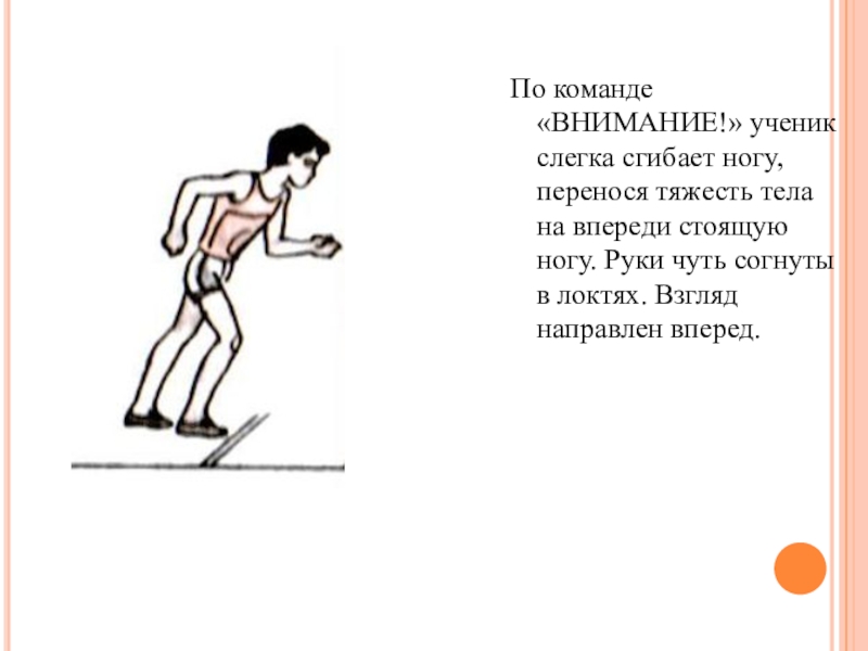 По команде «ВНИМАНИЕ!» ученик слегка сгибает ногу, перенося тяжесть тела на впереди стоящую ногу. Руки чуть согнуты
