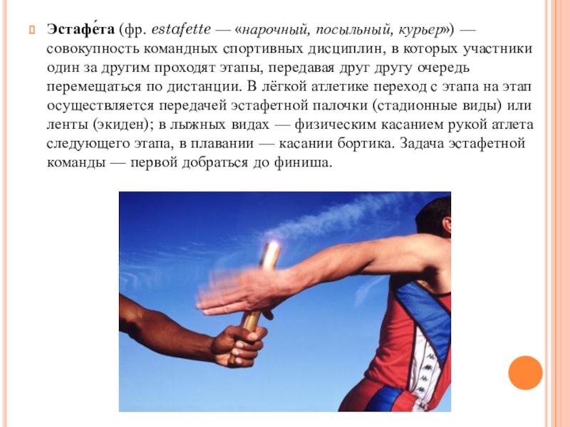 Слайд 18Эстафе́та (фр. estafette — «нарочный, посыльный, курьер») — совокупность командных спортивных дисциплин, в которых