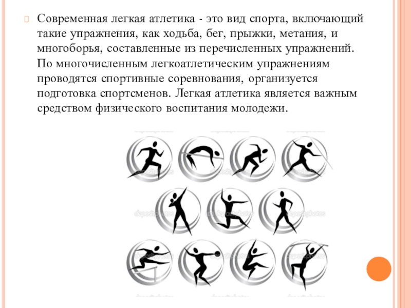 Слайд 4Современная легкая атлетика - это вид спорта, включающий такие упражнения, как