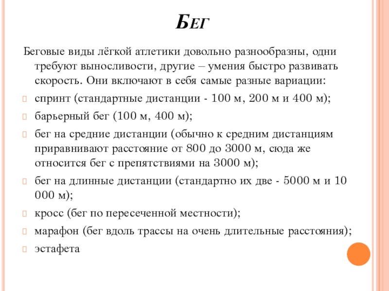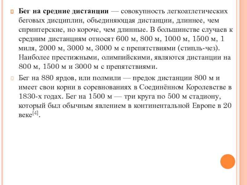 Слайд 13Бег на средние дистанции — совокупность легкоатлетических беговых дисциплин, объединяющая дистанции, длиннее,
