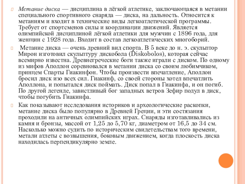 Слайд 31Метание диска — дисциплина в лёгкой атлетике, заключающаяся в метании специального спортивного