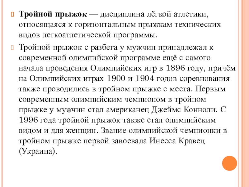 Слайд 23Тройной прыжок — дисциплина лёгкой атлетики, относящаяся к горизонтальным прыжкам технических видов