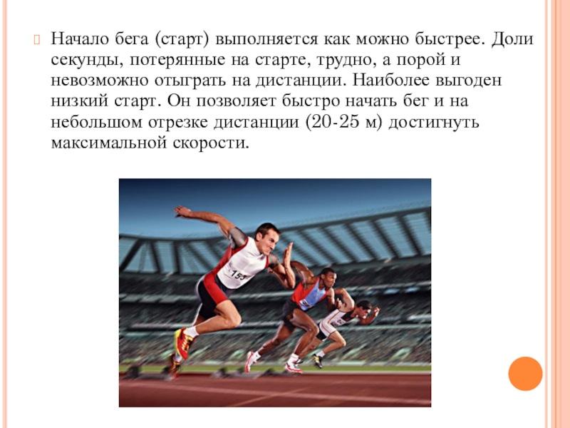 Слайд 8Начало бега (старт) выполняется как можно быстрее. Доли секунды, потерянные на