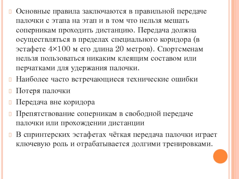 Слайд 19Основные правила заключаются в правильной передаче палочки с этапа на этап