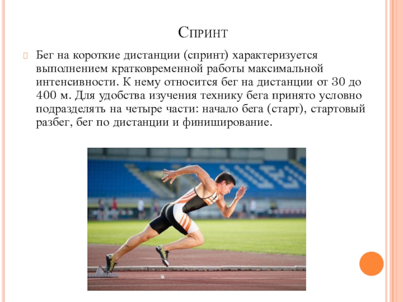 Бег на короткие дистанции (спринт) характеризуется выполнением кратковременной работы максимальной интенсивности.