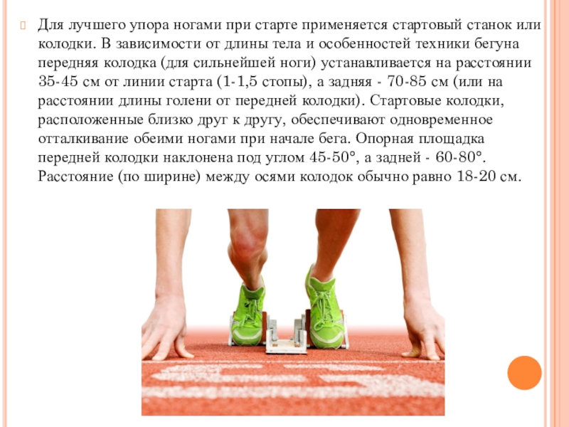 Слайд 9Для лучшего упора ногами при старте применяется стартовый станок или колодки.