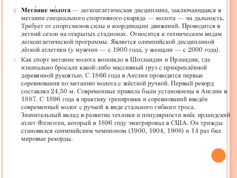 Слайд 29Мета́ние мо́лота — легкоатлетическая дисциплина, заключающаяся в метании специального спортивного снаряда — молота —