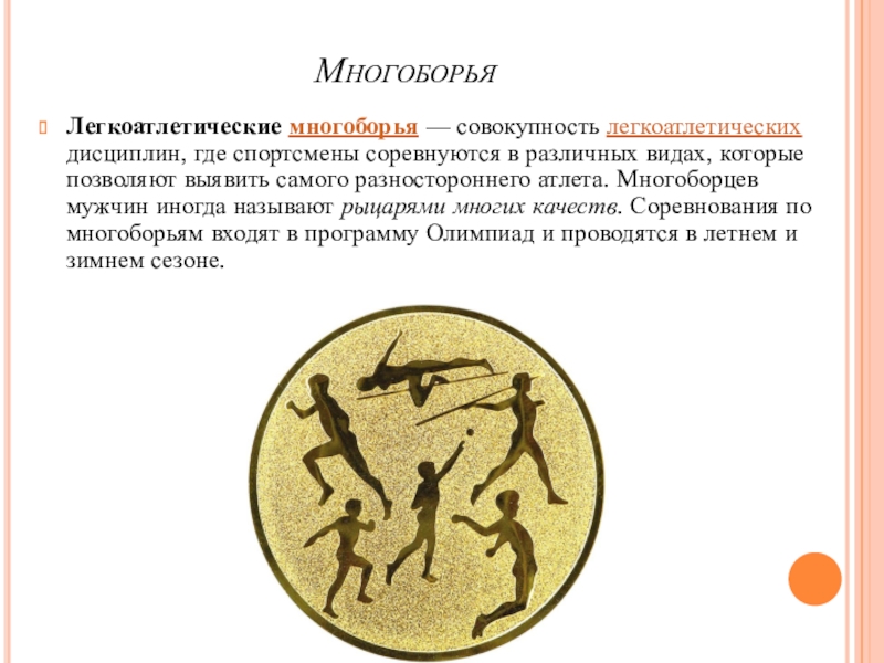 которые позволяют выявить самого разностороннего атлета. Многоборцев мужчин иногда называют рыцарями многих качеств. Соревнования по многоборьям входят в программу Олимпиад и проводятся в летнем и зимнем сезоне.