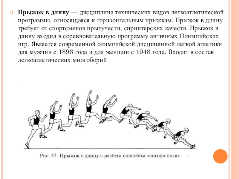 Слайд 21Прыжок в длину — дисциплина технических видов легкоатлетической программы, относящаяся к горизонтальным