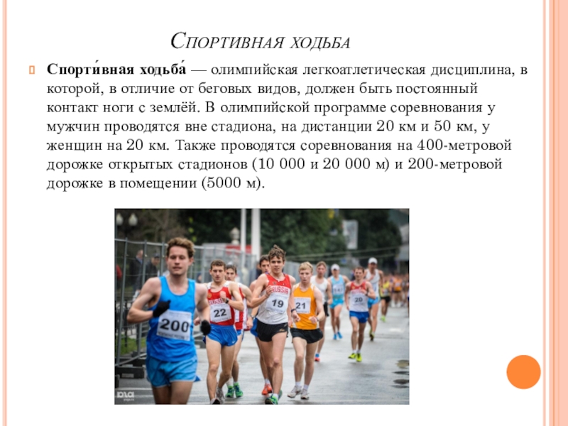 беговых видов, должен быть постоянный контакт ноги с землёй. В олимпийской программе соревнования у мужчин проводятся вне стадиона, на дистанции 20 км и 50 км, у женщин на 20 км. Также проводятся соревнования на 400-метровой дорожке открытых стадионов (10 000 и 20 000 м) и 200-метровой дорожке в помещении (5000 м).