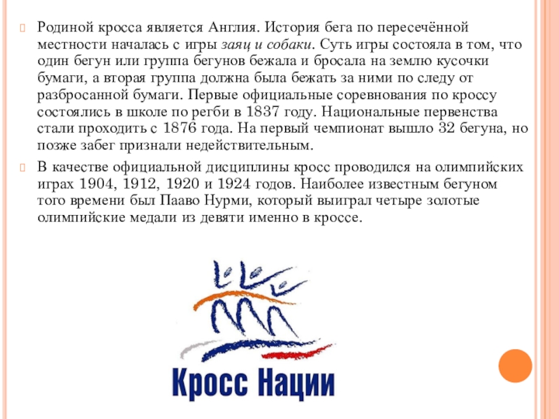 Слайд 16Родиной кросса является Англия. История бега по пересечённой местности началась с