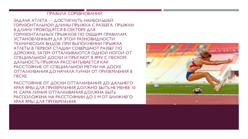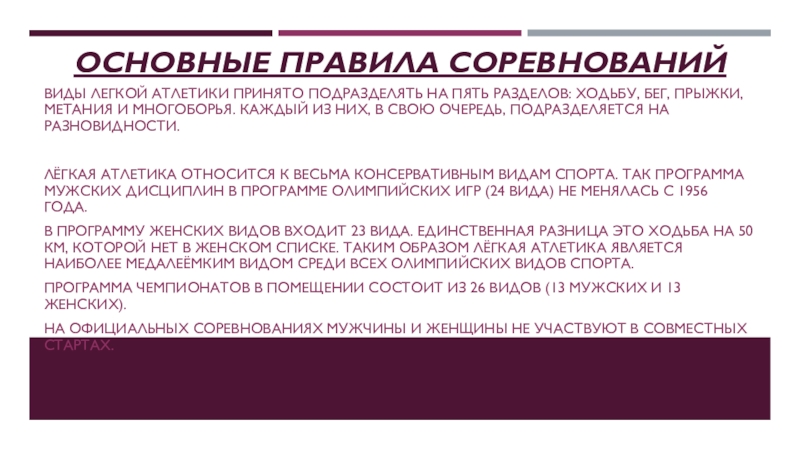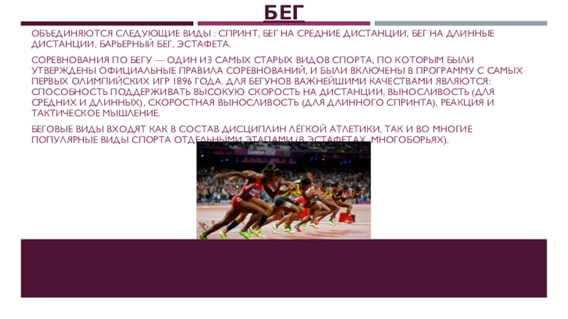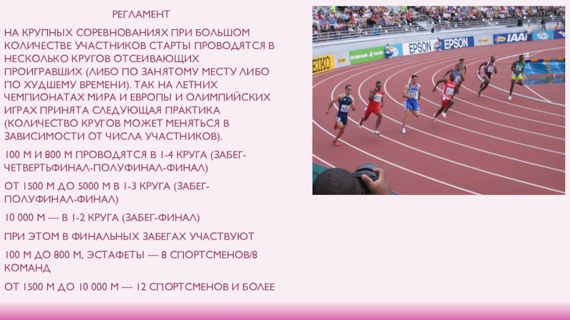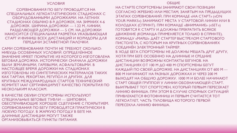 В ХОДЕ БЕГА СПОРТСМЕНЫ НЕ ДОЛЖНЫ МЕШАТЬ ДРУГ ДРУГУ, ХОТЯ ПРИ БЕГЕ ОСОБЕННО НА ДЛИННЫЕ И СРЕДНИЕ ДИСТАНЦИИ ВОЗМОЖНЫ КОНТАКТЫ БЕГУНОВ. НА ДИСТАНЦИЯХ ОТ 100 М ДО 400 М СПОРТСМЕНЫ БЕГУТ КАЖДЫЙ ПО СВОЕЙ ДОРОЖКЕ. НА ДИСТАНЦИЯХ ОТ 600 М — 800 М НАЧИНАЮТ НА РАЗНЫХ ДОРОЖКАХ И ЧЕРЕЗ 200 М ВЫХОДЯТ НА ОБЩУЮ ДОРОЖКУ. 1000 М И БОЛЕЕ НАЧИНАЮТ СТАРТ ОБЩЕЙ ГРУППОЙ У ЛИНИИ ОБОЗНАЧАЮЩЕЙ СТАРТ.