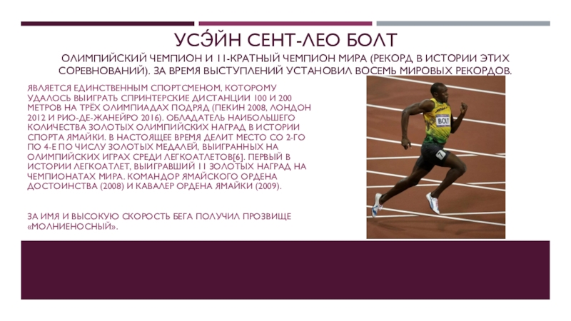 Является единственным спортсменом, которому удалось выиграть спринтерские дистанции 100 и 200 метров на трёх Олимпиадах подряд (Пекин 2008, Лондон 2012 и Рио-де-Жанейро 2016). Обладатель наибольшего количества золотых олимпийских наград в истории спорта Ямайки. В настоящее время делит место со 2-го по 4-е по числу золотых медалей, выигранных на Олимпийских играх среди легкоатлетов[6]. Первый в истории легкоатлет, выигравший 11 золотых наград на чемпионатах мира. Командор ямайского ордена Достоинства (2008) и кавалер ордена Ямайки (2009).
