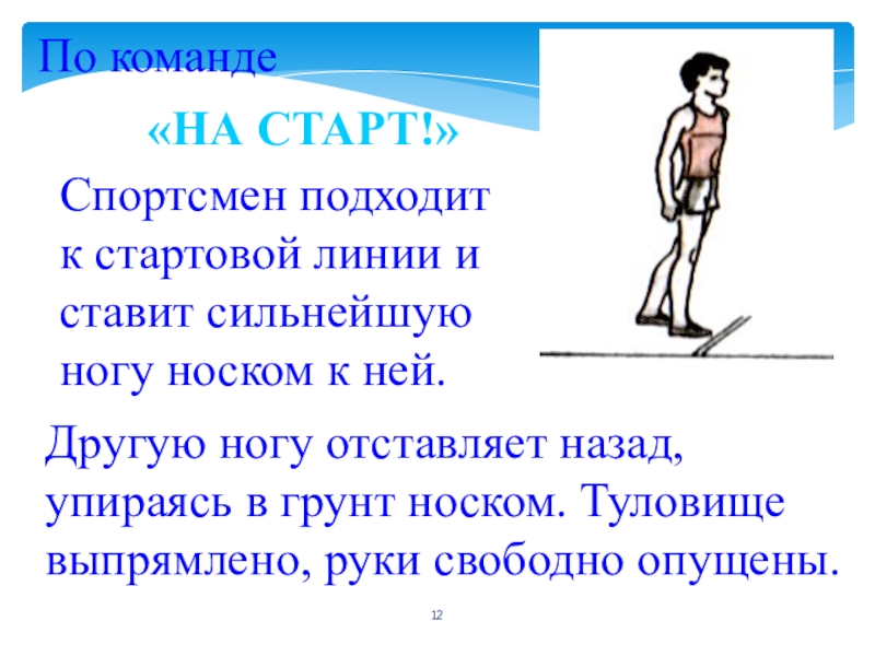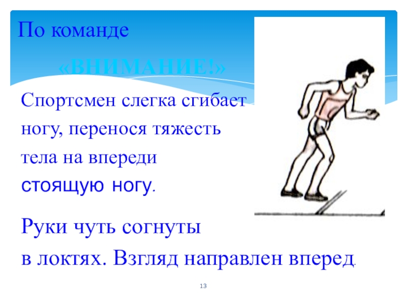 Другую ногу отставляет назад, упираясь в грунт носком. Туловище выпрямлено, руки свободно опущены.