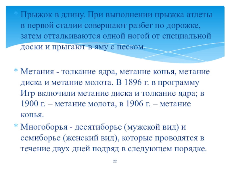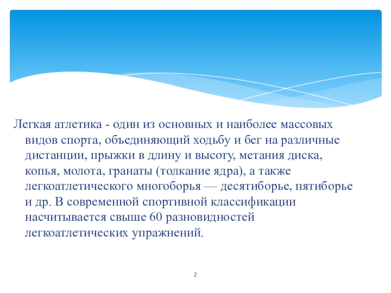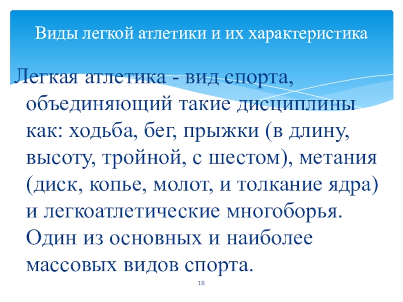 Виды легкой атлетики принято подразделять на пять разделов: ходьбу, бег, прыжки, метания и многоборья.