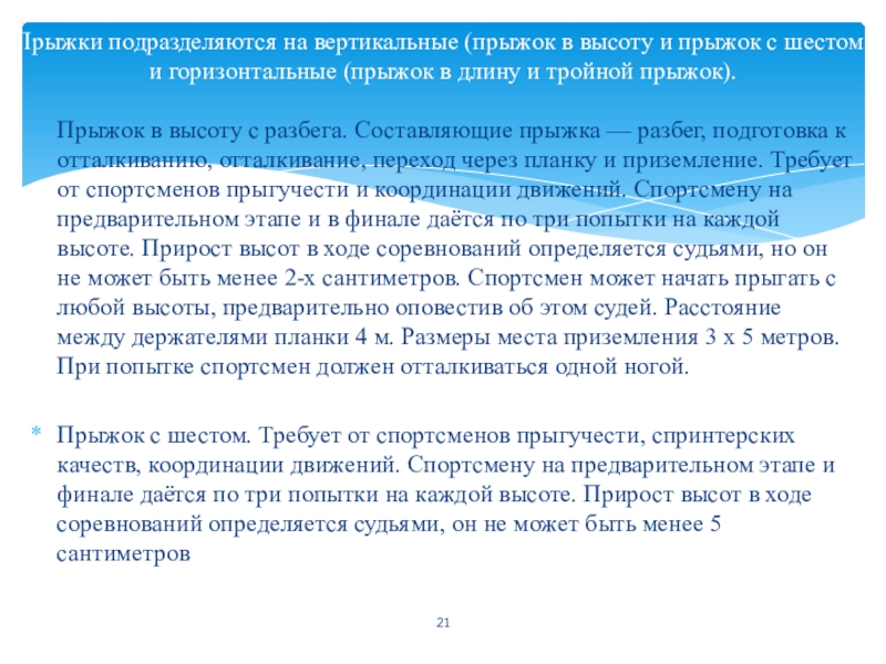 Прыжки подразделяются на вертикальные (прыжок в высоту и прыжок с шестом) и горизонтальные (прыжок в длину и тройной прыжок).