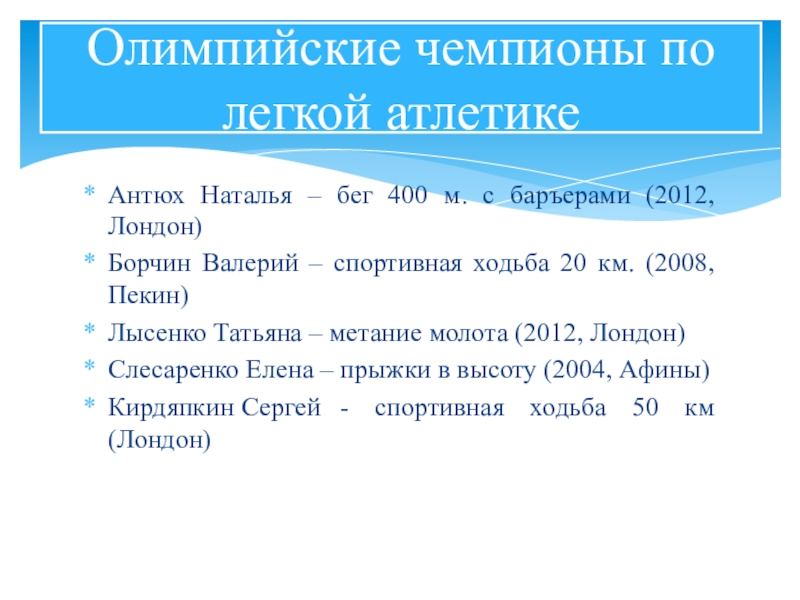 Антюх Наталья – бег 400 м. с баръерами (2012, Лондон)Борчин Валерий – спортивная ходьба 20 км. (2008,