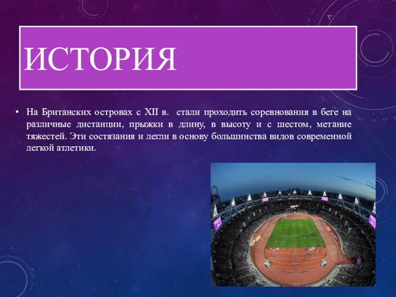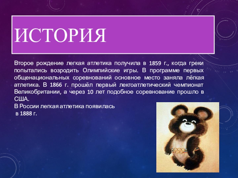 возродить Олимпийские игры. В программе первых общенациональных соревнований основное место заняла лёгкая атлетика. В 1866 г. прошёл первый лекгоатлетический чемпионат Великобритании, а через 10 лет подобное соревнование прошло в США.
