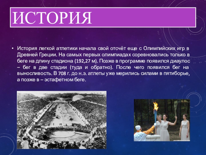 Древней Греции. На самых первых олимпиадах соревновались только в беге на длину стадиона (192,27 м). Позже в программе появился диаулос – бег в две стадии (туда и обратно). После чего появился бег на выносливость. В 708 г. до н.э. атлеты уже мерились силами в пятиборье, а позже в – эстафетном беге.