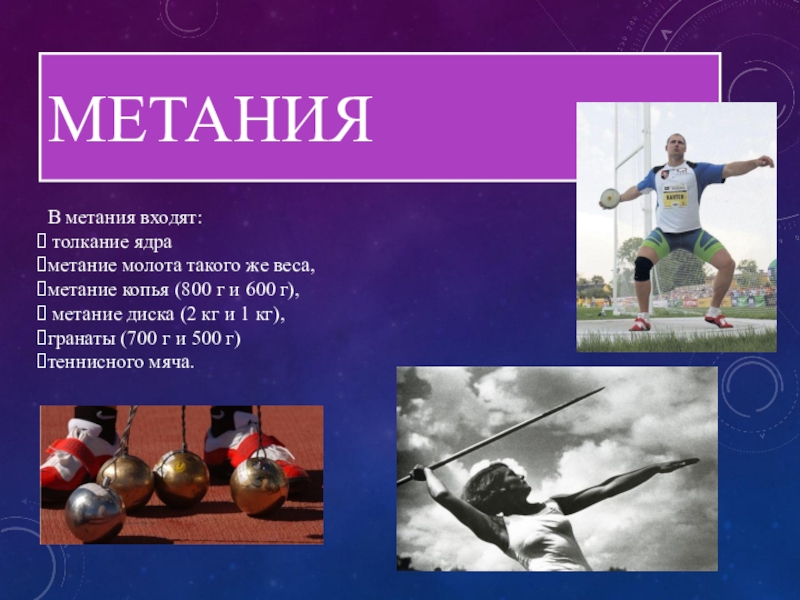 и метания. Объединяет следующие дисциплины: беговые виды, спортивную ходьбу, технические виды (прыжки и метания), многоборья, пробеги (бег по шоссе) и кроссы (бег по пересечённой местности).