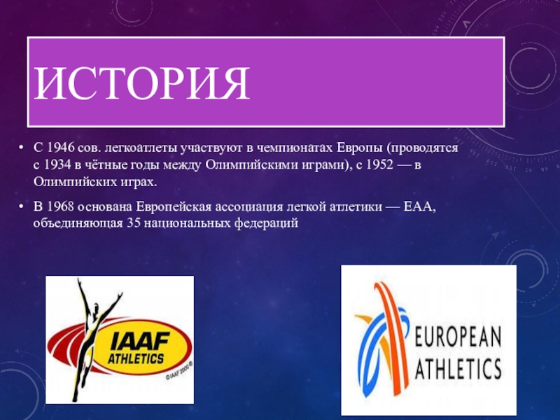 С 1946 сов. легкоатлеты участвуют в чемпионатах Европы (проводятся с 1934