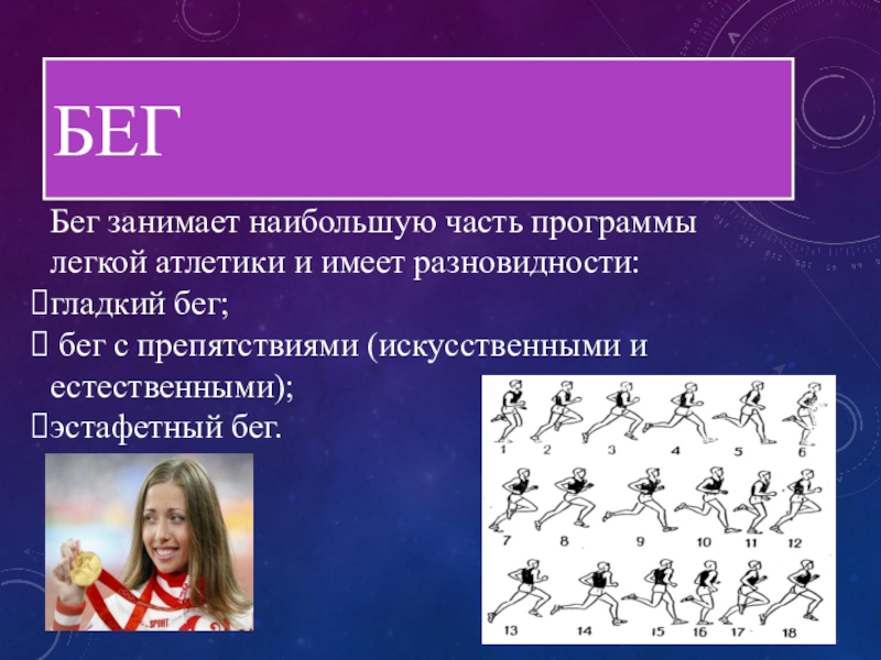 Бег занимает наибольшую часть программы легкой атлетики и имеет разновидности: